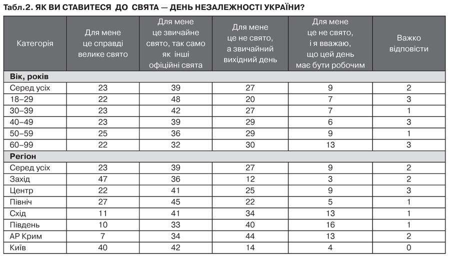 - З тим, що це велике свято, згодні 23% респондентів, для 39% - це звичайне свято, як і всі інші офіційні свята, 27% вважають, що це звичайний вихідний день, і 9% вважають, що це не свято, і має бути робочим днем. Тут значна різниця не за віковими групами, а за регіонами. У Західному регіоні 47% респондентів вважають, що це справді велике свято. У Києві такої думки дотримуються 40%, що вдвічі більше, ніж середній показник по країні. У Криму вважають День незалежності великим святом 7% опитаних, на Сході - 11%. За думкою, що День незалежності має бути звичайним робочим днем, лідери Крим, Схід і Південь - у цьому повна відповідність настроям, які спостерігаються загалом щодо незалежності. А що вищий рівень освіти громадян, то більше в них сприйняття незалежності як справді значущого, великого свята.