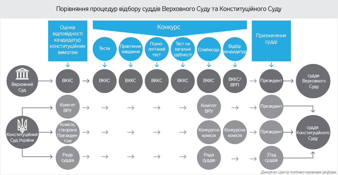 З описаного видно, що за даною процедурою відбувається формальна перевірка відповідності кандидатур законодавчим вимогам, встановленим для судді Конституційного суду. Ще більш очевидним це стає, якщо порівняти цю процедуру з конкурсним відбором для суддів Верховного суду. З даного переліку - виключно співбесіда з майбутнім суддею КСУ, що дозволяє встановити додаткову інформацію, відмінну від тієї, яка подана кандидатом. У Законі відсутні положення щодо проведення різноманітних тестувань (практичних завдань, психологічних тестів тощо). Чи дає це змогу встановити визнаний рівень компетентності правника? Питання риторичне.