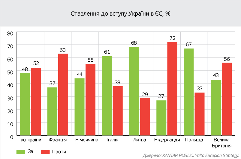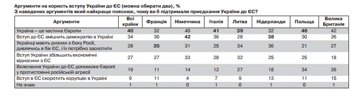 Основним же аргументом для тих, хто голосував "за" членство нашої країни в ЄС, якщо узагальнити відповіді всіх респондентів у семи країнах, стала їхня переконаність у тому, що "Україна - це частина Європи". Головним це було для більшості респондентів в Італії (41%), Литві (39%), Польщі (46%) і Великій Британії (42%).