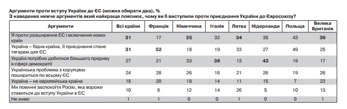 А ось бажання "умиротворити Росію, яка вороже ставиться до приєднання України до ЄС", посіло серед запропонованих аргументів останнє місце майже в усіх країнах - крім Литви (26%) і Польщі (10%).