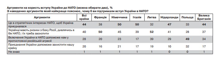 Основні аргументи "за" (можна було вибрати зі списку не більше двох) такі. На першому місці (44% усіх респондентів) - "Прийняти Україну - це стратегічний інтерес НАТО". Так вважають 44% опитаних британців, 47% голландців, по 50% італійців та німців.