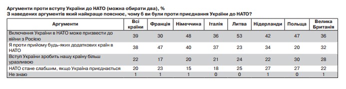 У французьких та італійських противників євроатлантичної інтеграції України основним був аргумент "Я проти приєднання до НАТО будь-якої нової країни": його вибрали 47 і 37%, відповідно.