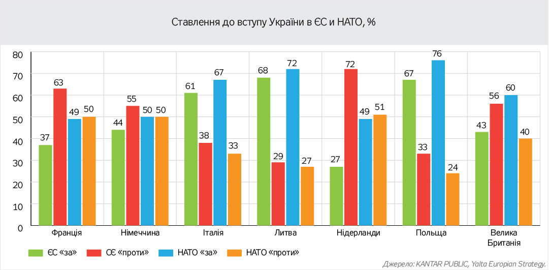 Увага, відповідь: попри скепсис тих, хто вважає, що країні, яка воює з Росією, годі й думати про членство в НАТО, 58% респондентів семи європейських держав Північноатлантичного альянсу сказали "так" українському членству.