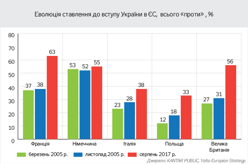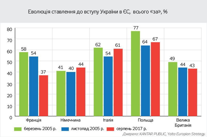 Найбільші ж зміни стосовно України відбулися за останні 12 років у Франції. Так, європейську ідентичність України нині визнають лише 48% французів, але ж у березні 2005-го цей показник становив 63%. І якщо в березні 2005-го "за" можливе членство України в ЄС висловилися 58% тамтешніх респондентів, а в листопаді того самого - 54%, то в серпні 2017-го - лише 37%! При цьому значно побільшало противників входження нашої країни в Євросоюз: із 37-38% у 2005-му до 63% - у 2017-му (а тих, хто "безперечно, проти", - з 12-13% до 35%).