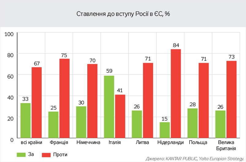 Насамперед звертає на себе увагу той факт, що Росія в рейтингу запропонованих на розгляд європейців країн вибилася на друге місце, обійшовши і офіційного кандидата на членство в ЄС - Туреччину, і Марокко, яке перебуває в давніх відносинах "налагодження асоціації" з Євросоюзом; попри збройну агресію проти України й ігнорування безлічі міжнародних договорів; попри те, що методи гібридної війни застосовуються РФ уже й у Європі (або ж саме завдяки останньому?). 33% прихильників членства Росії в ЄС - це третина населення опитаних країн…