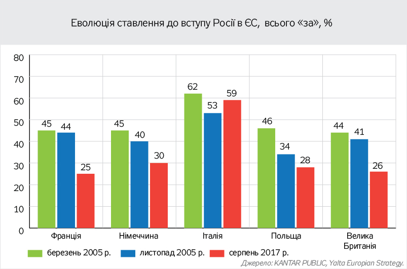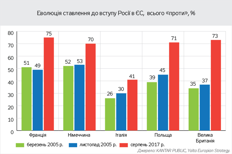 Здивувала Франція. Про її давнє русофільство відомо всім. Але! Нині 75% опитаних французів не бажають бачити Росію в Євросоюзі. За її членство лише 25%, але ж 2005-го таких у Франції було 45%. При цьому впадає в око те, що значно побільшало французів, які "точно проти" (з 19% у березні 2005-го - до 46% у серпні 2017-го).