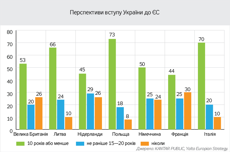 Мінімальну підтримку (11% по всіх країнах) здобула пропозиція почати переговори про вступ України до ЄС прямо зараз. Найбільше цей варіант сподобався полякам (17%).