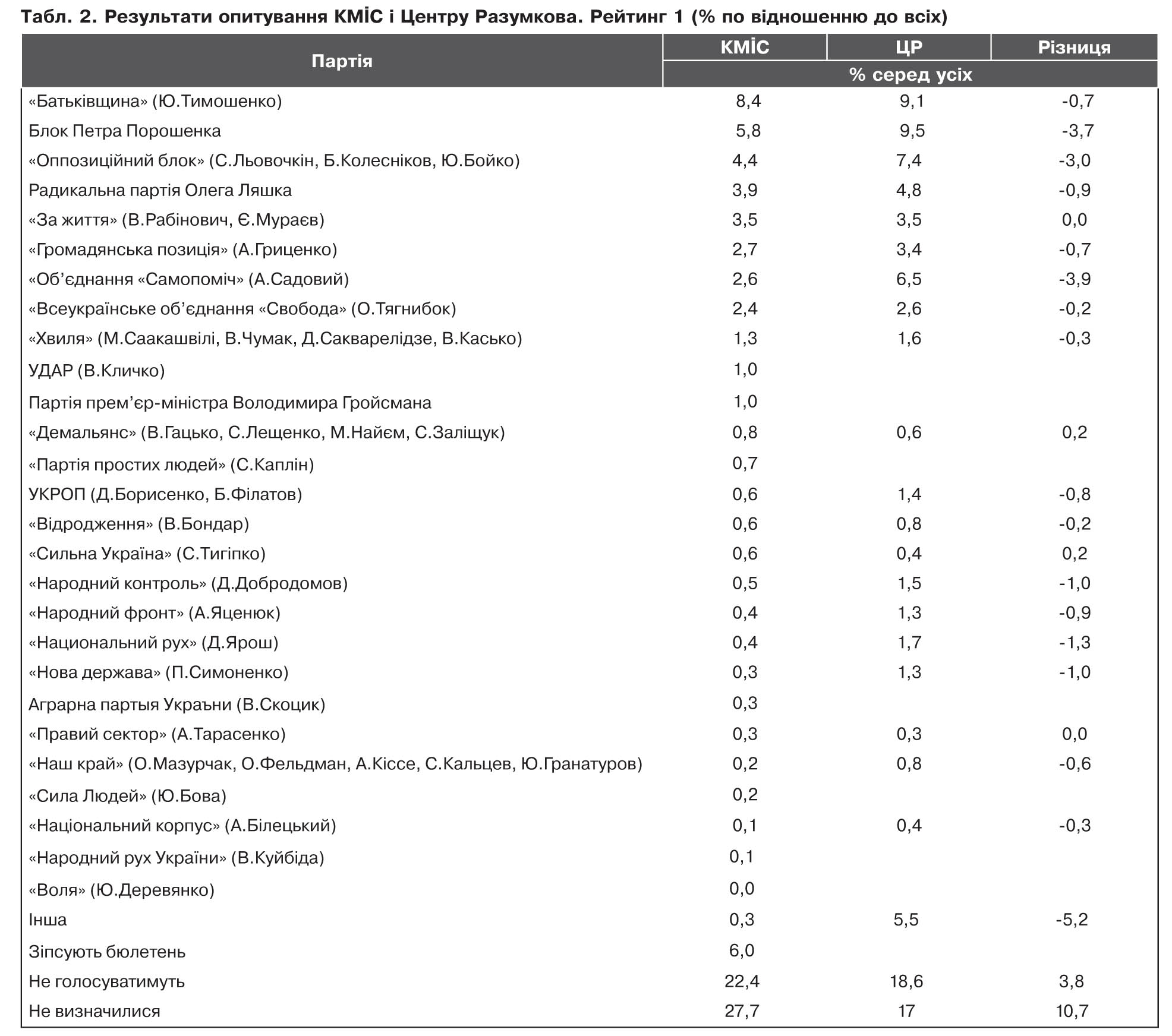 За даними КМІС (див. табл. 1) "Батьківщина" отримує 8,4% електоральної підтримки, а за даними Центру Разумкова - трохи більше: 9,1%, тобто щодо партії Тимошенко різниця незначна. А от щодо Блоку Порошенка в КМІС 5,8%, а в ЦР - 9,5%, тобто більше на 3,7 відсоткового пункту, це значима різниця. Чому? У списку КМІС на сім партій більше, і є ще пункт "зіпсую бюлетень", ці партії можуть "відкушувати" щось від рейтингу Блоку Порошенка (особливо УДАР і партія Гройсмана, разом 2%, і якщо їх додати до рейтингу Блоку Порошенка, то відставання від "Батьківщини" буде лише 1,3 відсоткового пункту). Але головна відмінність наших даних - у ЦР на 11% менше тих, хто не визначився, із цих відсотків щось додалося до рейтингу Порошенка. У КМІС запитання про вибір стояли на початку анкети, у ЦР - після запитань про довіру до соціальних інститутів і політиків, що могло "розігріти" респондентів, дати час подумати про довіру до політиків і зменшити число тих, хто не визначився, в результатах ЦР.