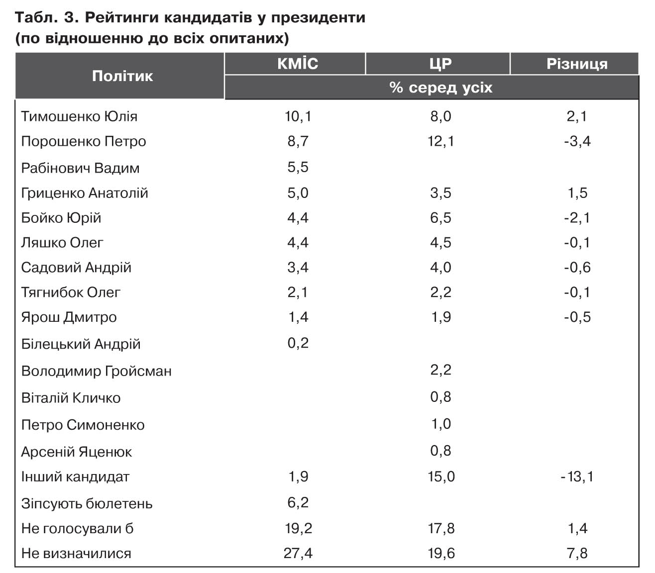 Гірший стан речей із президентським рейтингом, але тут порівнянність списків іще нижча, збігаються лише вісім кандидатів з 14, при строгому професійному підході таке зазвичай не порівнюють (див. табл. 3, наведено, зрозуміло, лише рейтинг 1).