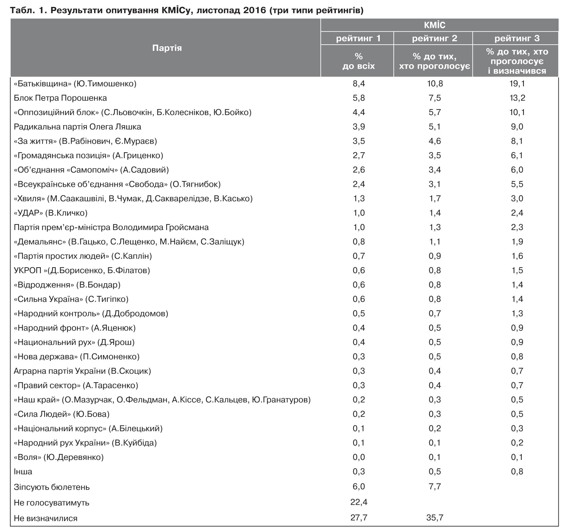 РЕЙТИНГ 1 - відсоток тих, хто вибрав ту чи іншу партію, відносно всіх опитаних. Це перше, що завжди оприлюднюють (слава Богу, хоч про це домовилися). Власне, це вихідна інформація, безпосередньо результати опитування - тобто те, що ми отримали від людей. Це сірячинна правда, або, як казав Остап Бендер, вона ж плоскінна, домоткана й кондова. Це, можна сказати, технічні дані, вони потрібні для порівняння даних різних досліджень, щоб можна було перерахувати дані двох компаній і звести до єдиного знаменника. Словом, вони з усіх поглядів хороші, але вони не показують, які партії пройдуть до парламенту. Тлумачити ці показники як відсотки, які партії отримають на виборах, некоректно, бо серед них великий відсоток тих, хто не прийде, і тих, хто не визначився. Наприклад, у даних КМІС таких близько 50% (див. табл. 1, перша колонка з відсотками ). А на виборах таких немає, там сума голосів дорівнює 100%, а не 50%, тобто ці відсотки в середньому вдвічі менші, ніж на виборах, і якщо на них орієнтуватися, то до парламенту проходять лише дві партії - Тимошенко і Порошенка. У табл. 1 наведено цей рейтинг з нашого прес-релізу.