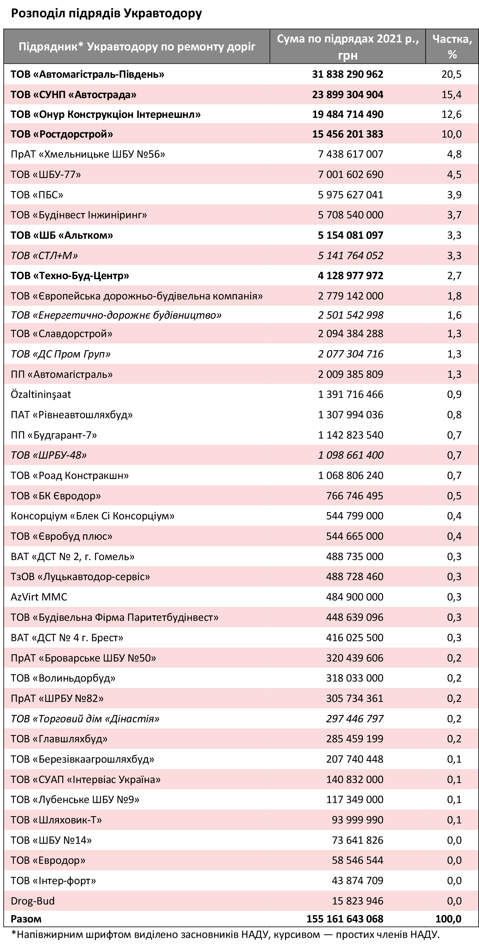 Нагадаємо, розкол серед фаворитів Укравтодору почався цієї весни із заяви власника «Автостради» Максима Шкіля про вихід із Національної асоціації дорожників України (НАДУ). Її на початку «Великого будівництва» заснували шість великих компаній, щодо яких «Ліга антитрасту» подавала заяву в АМКУ з переліком ознак картельної змови. Через півтора року цей картель дав тріщину, й «Автострада» цього літа почала дедалі рідше перетинатися з «Автомагістраллю-Південь» і «Онуром».