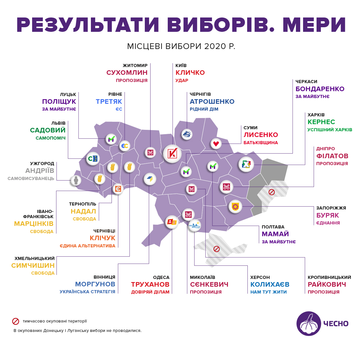«Рух ЧЕСНО» проаналізував результати виборів 25 жовтня у містах — обласних центрах. Дані свідчать, що майже половина мерів перемогли в першому турі, решта, за винятком обраного громадою у 2015 році мера Чернівців Олексія Каспрука, вийшли в другий і, по суті, теж перемогли.