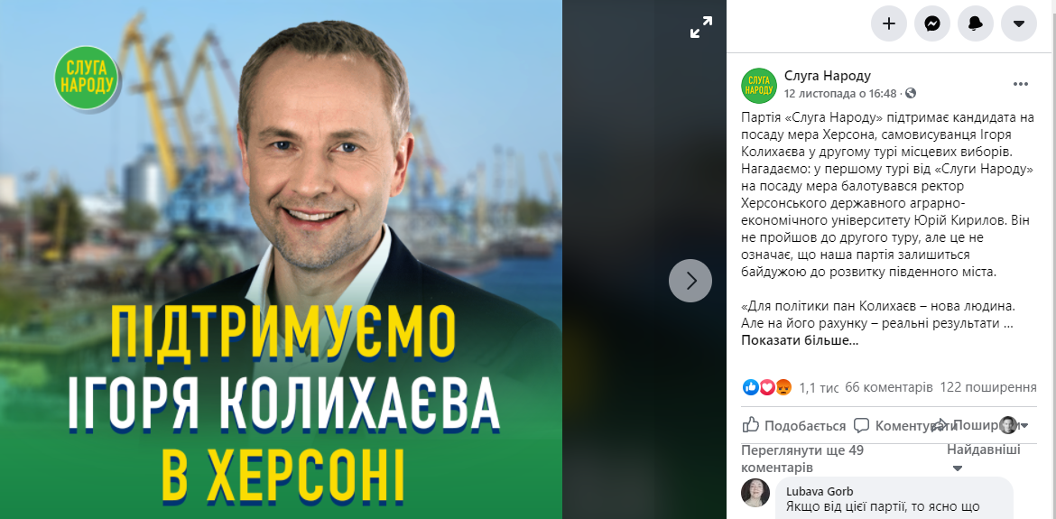 Колихаєв переміг Володимира Сальда, який раніше тричі був мером Херсона. Чинний мер Херсона цього року не балотувався.