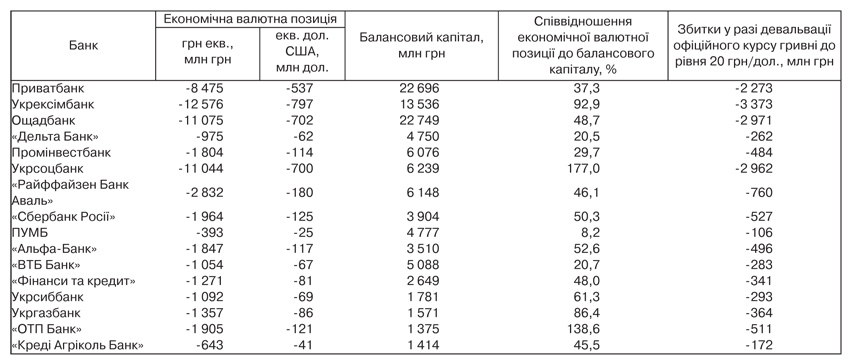 Звичайно, є спокуса злякатися та зафіксувати офіційну вартість долара на рівні 21–22 грн. Адже курсові втрати за валютною позицією найбільших банків обчислюються мільярдами гривень, навіть виходячи з офіційного курсу 20 грн/дол. (див. табл. на 2-й стор.). Рух до позначки "25" подвоює ці збитки.