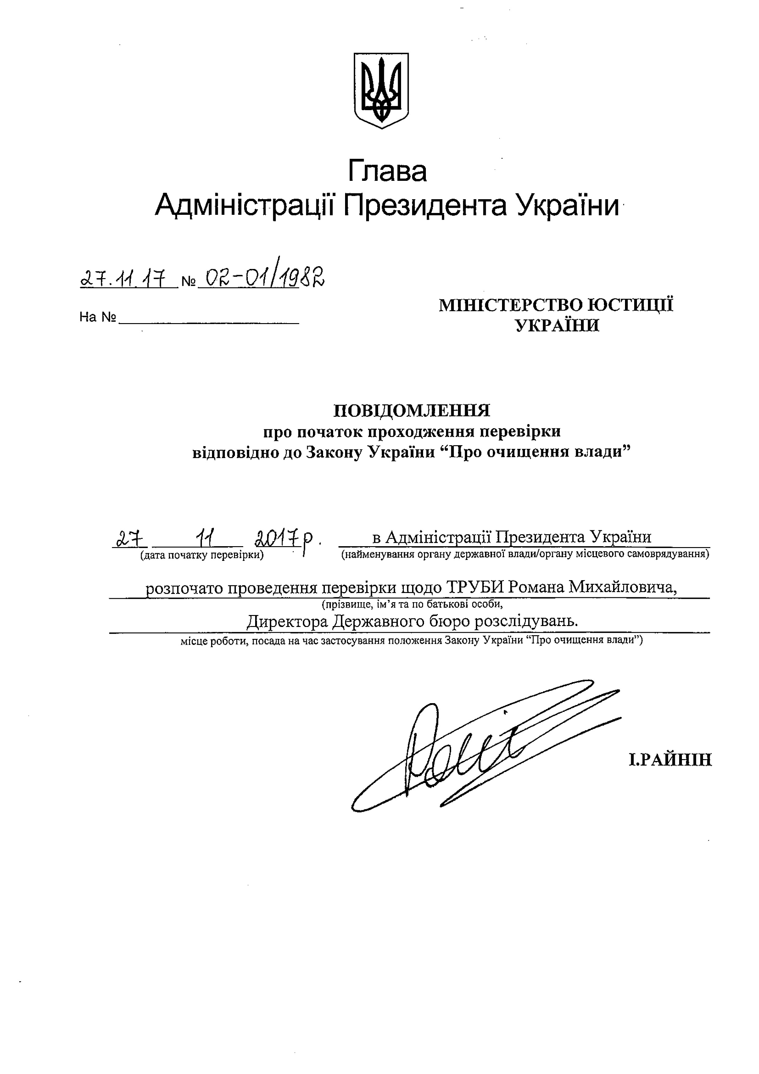 Згодом, 27 листопада, вийшло повідомлення за підписом глави Адміністрації президента України Ігоря Райніна про початок проходження перевірки відповідно до Закону України "Про очищення влади".