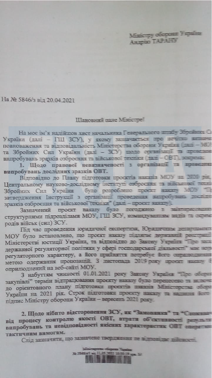 Суть листа зводиться до того, що начальник Генштабу дарма переживає — в нас усе гаразд: наказ Міноборони з інструкцією щодо проведення випробувань буде у вересні; збройні сили від контролю над якістю озброєння не усунені; завдання Державному науково-дослідному інституту випробувань і сертифікації озброєння та військової техніки нарізано.