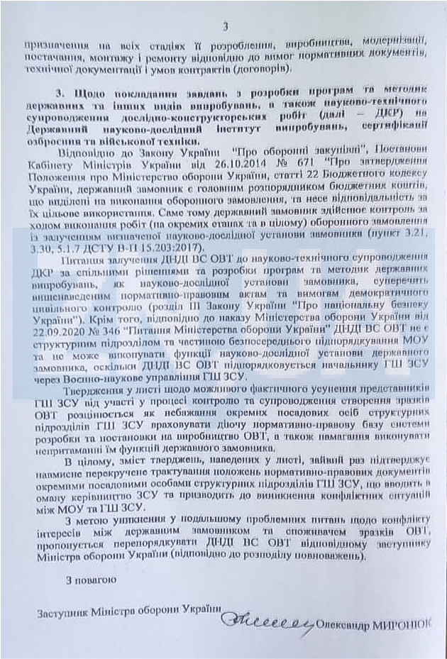 О.Миронюк у своєму листі міністрові каже, що ніякого усунення Генштабу від процесу контролю та супроводу створення ОВТ немає, і розцінює претензії як «небажання окремих посадових осіб структурних підрозділів ГШ ЗСУ враховувати чинну нормативно-правову базу системи розробки та постановки на виробництво ОВТ, а також спроби виконувати невластиві їм функції державного замовника». Такого роду дії, на думку Миронюка, і призводять до конфліктних ситуацій між Міноборони та Генштабом.