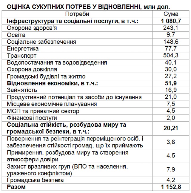 Таким чином, за попередніми підрахунками, тільки на перший етап відновлення може знадобитися 1 млрд 152 млн 800 тис. дол. Ба більше, як уточнюють автори документа, цей показник є частковим і може істотно зрости. Бо для ретельного визначення вартості потрібні масштабні консультації на рівні територіальних громад, провести які було неможливо через суворі часові обмеження термінів попередньої оцінки.