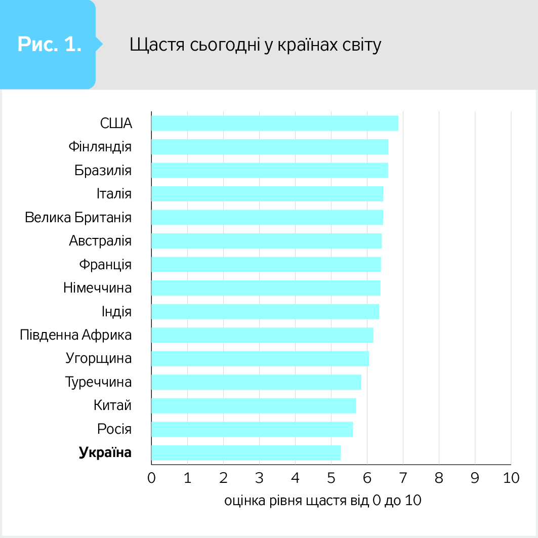 За 10-бальною шкалою "задоволеності життям тут і зараз", запропонованою Пінчуком і Вардом, українці виставили собі найнижчу оцінку, і Україна опинилася на першому місці серед найнещасніших держав. Звісно, в "ніштяк-лідерах" - переважно країни західної демократії, які мають високі життєві стандарти, верховенство права, демократичні свободи та масу інших досі ще недосяжних для нас ознак цивілізації. Західні держави сьогодні все ще сильні, і люди в них почуваються щасливішими. Але! Саме в цих державах панує найбільший песимізм із приводу їхнього майбутнього. Це чітко видно через призму очікувань того, наскільки щасливо може скластися доля їхніх дітей. Тоді як країни, "що розвиваються", значно більші оптимісти. Але не будемо забігати наперед. І подивимося, що для задоволення життям потрібно жителям різних народів, і чому саме щастя соціологи нарекли основною потребою більшості людей на планеті.