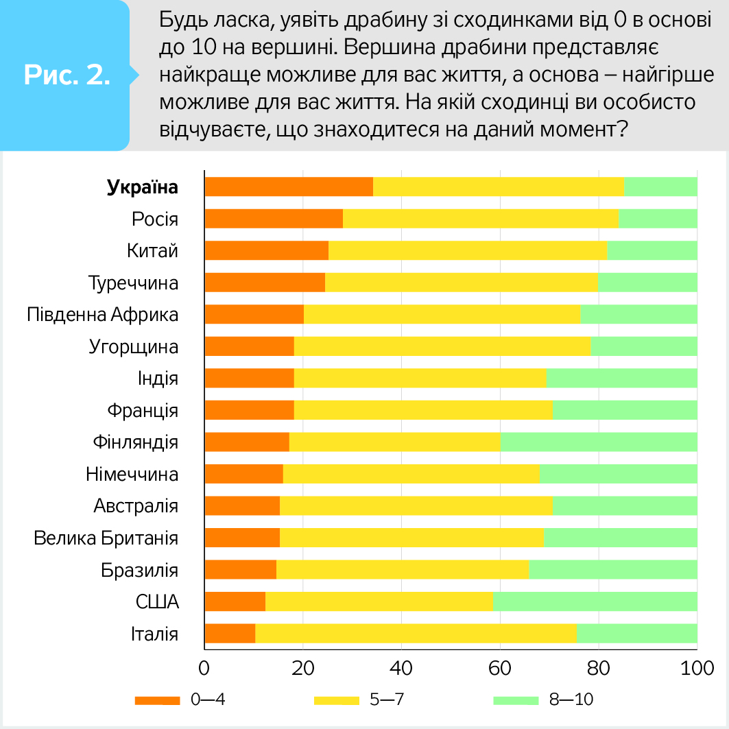 "Будь ласка, уявіть сходи зі східцями від 0 в основі до 10 на вершині. Вершина сходів представляє найкраще можливе для вас життя, а основа - найгірше з можливих. На якому східці ви перебуваєте на цей момент?" (рис. 2 на 2-й стор.).