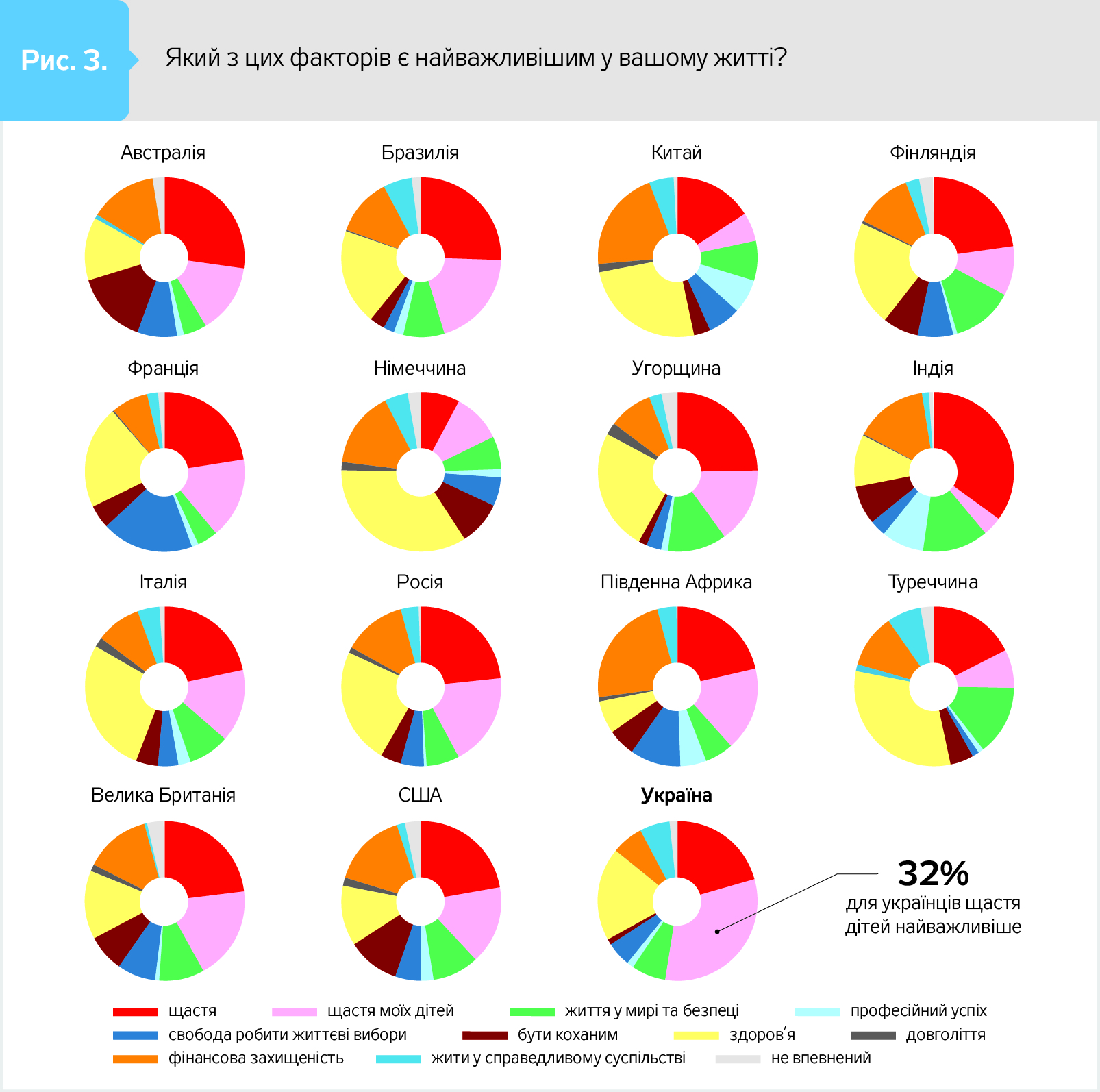 Дослідники опитали респондентів у 15 країнах: "Який із чинників найважливіший у вашому житті?" (рис. 3).