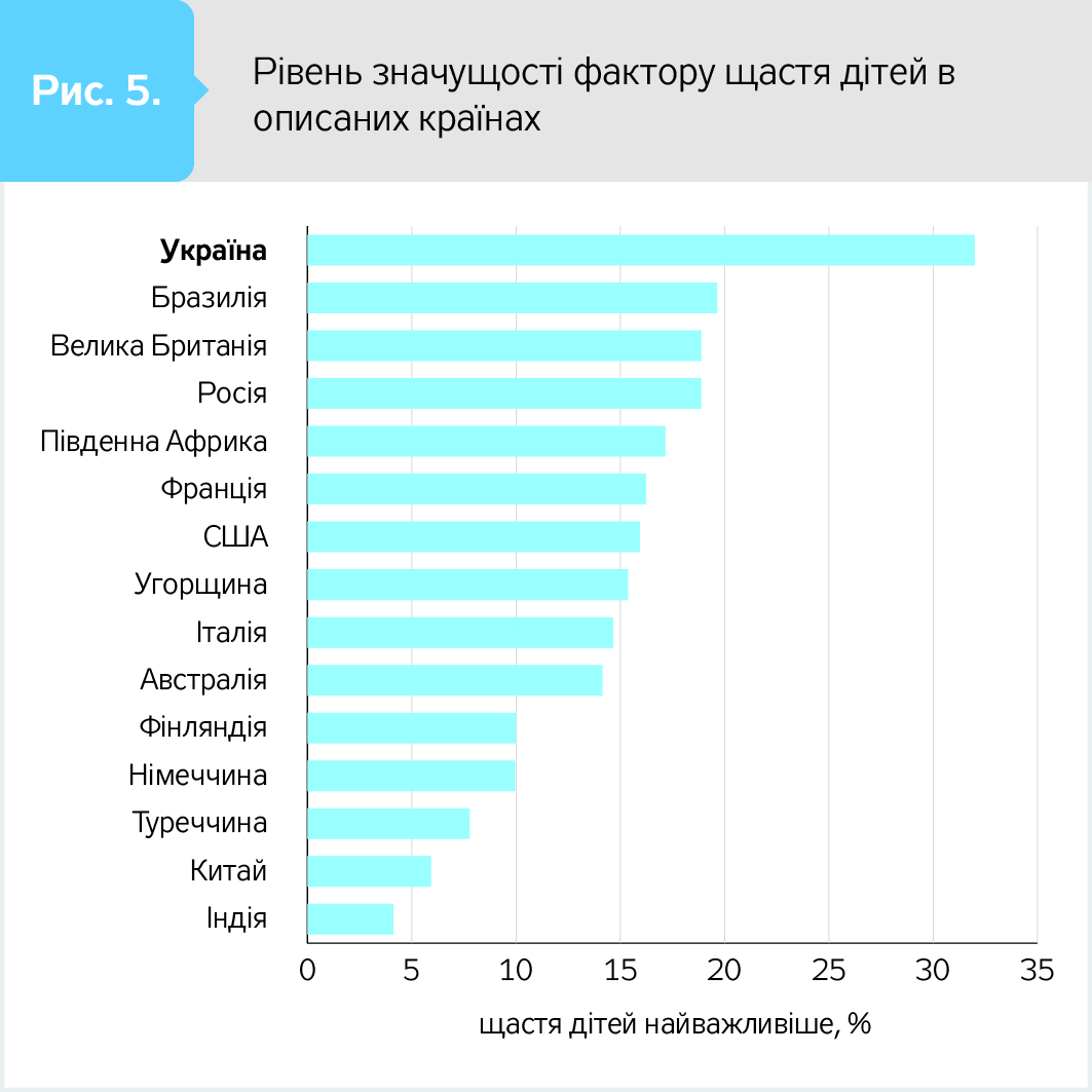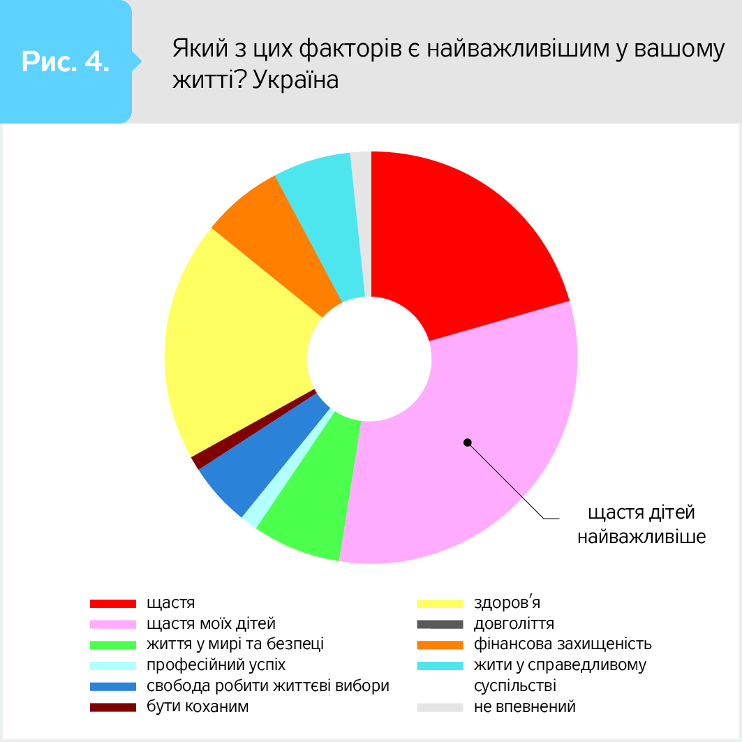 Україна - єдина країна з опитаних, громадяни якої на перше місце серед цінностей життя вивели щастя своїх дітей (рис. 4 та 5).