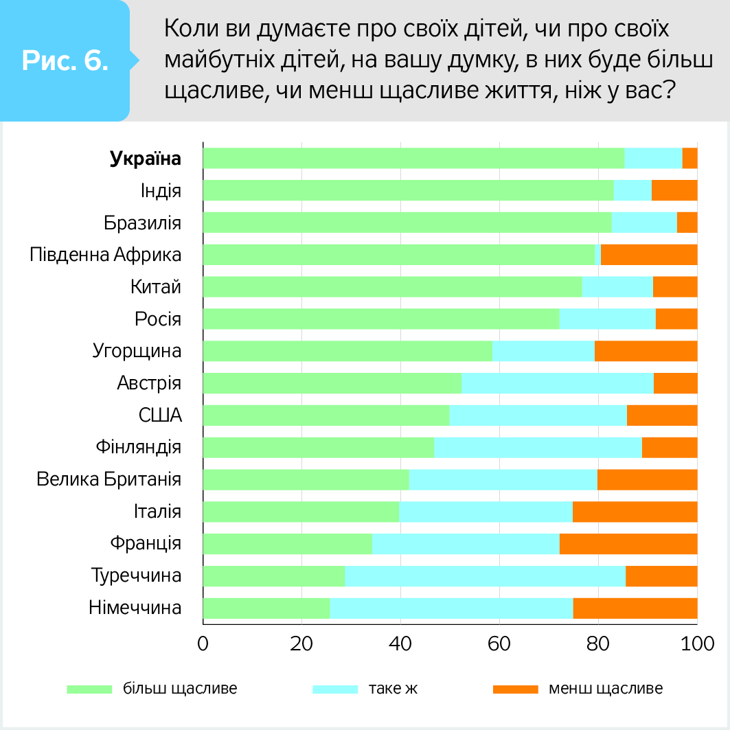Оптимістично дивляться в майбутнє Індія (83%), Бразилія (83%), Південно-Африканська Республіка (79%) та Китай (76%). Песимізм щодо майбутнього помітно домінує у Франції (лише 34% впевнені у перспективах щастя своїх дітей), Туреччині (29%) і особливо в Німеччині - 26% (рис. 6).