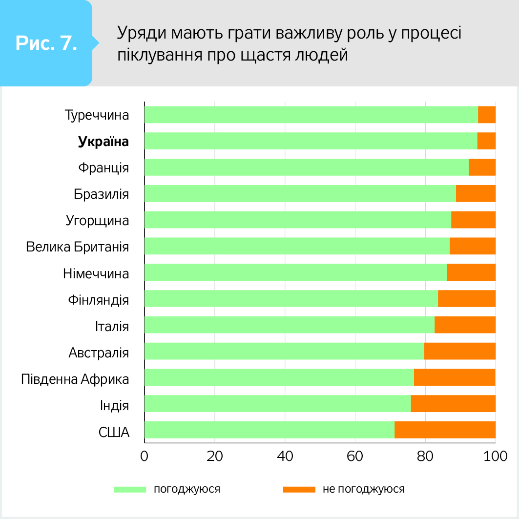 Загалом, на планеті 85% громадян вважають, що влада повинна відігравати важливу роль, турбуючись про щастя людей. Перша п'ятірка країн: Туреччина (95%), Україна (95%), Франція (92%), Бразилія (89%) і Угорщина (87%). Навіть в Америці, яка посіла останнє місце в цьому рейтингу сподівань, 71% покладається на "старшого брата".