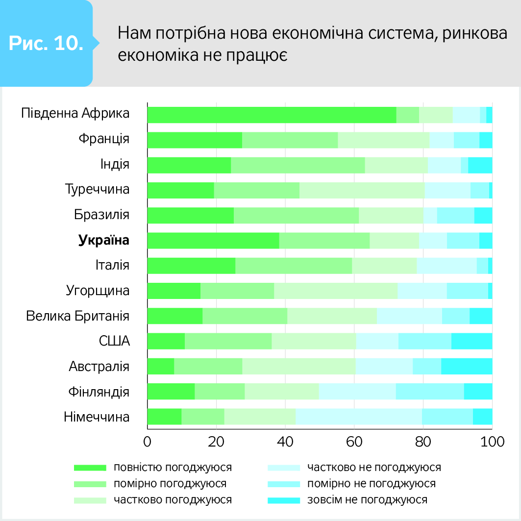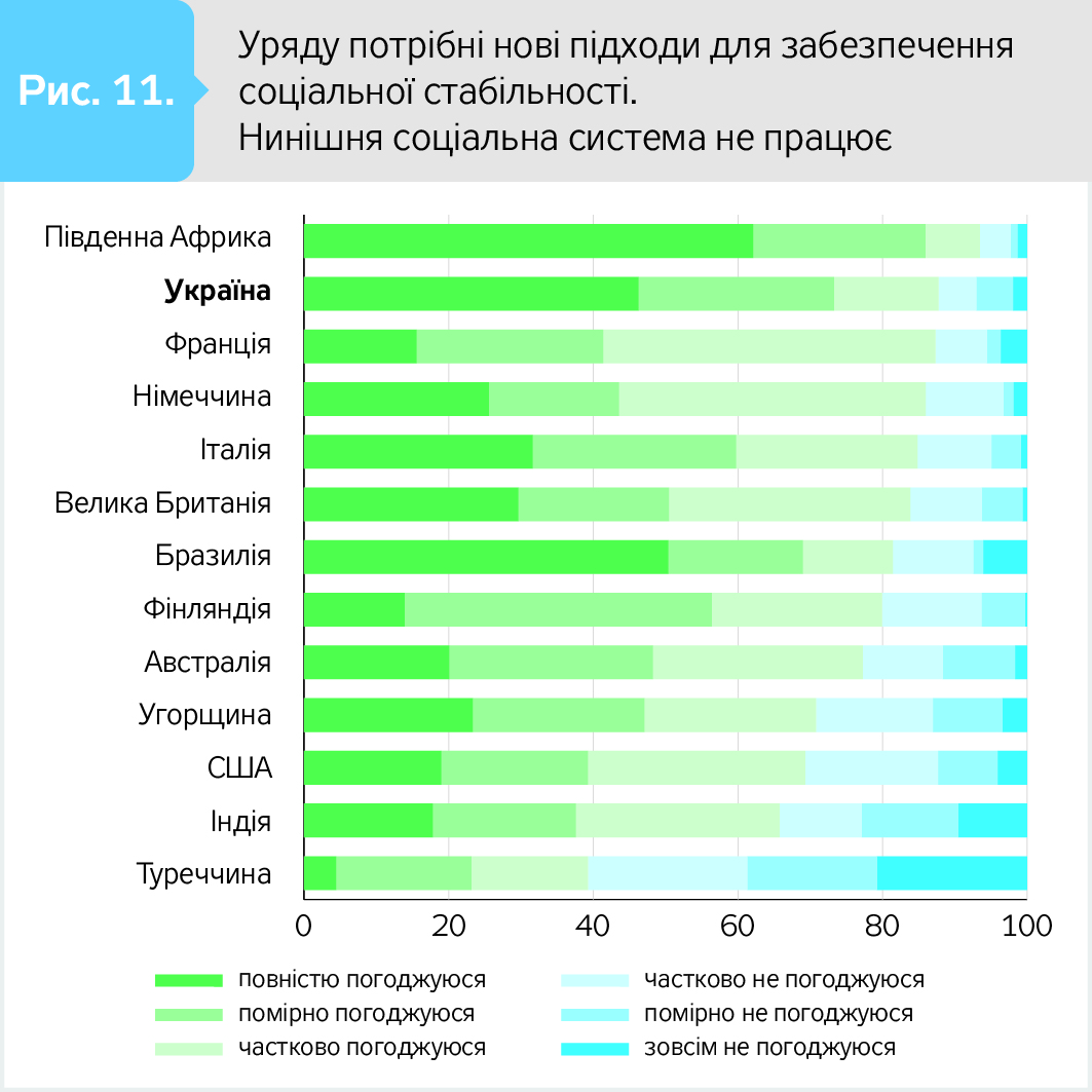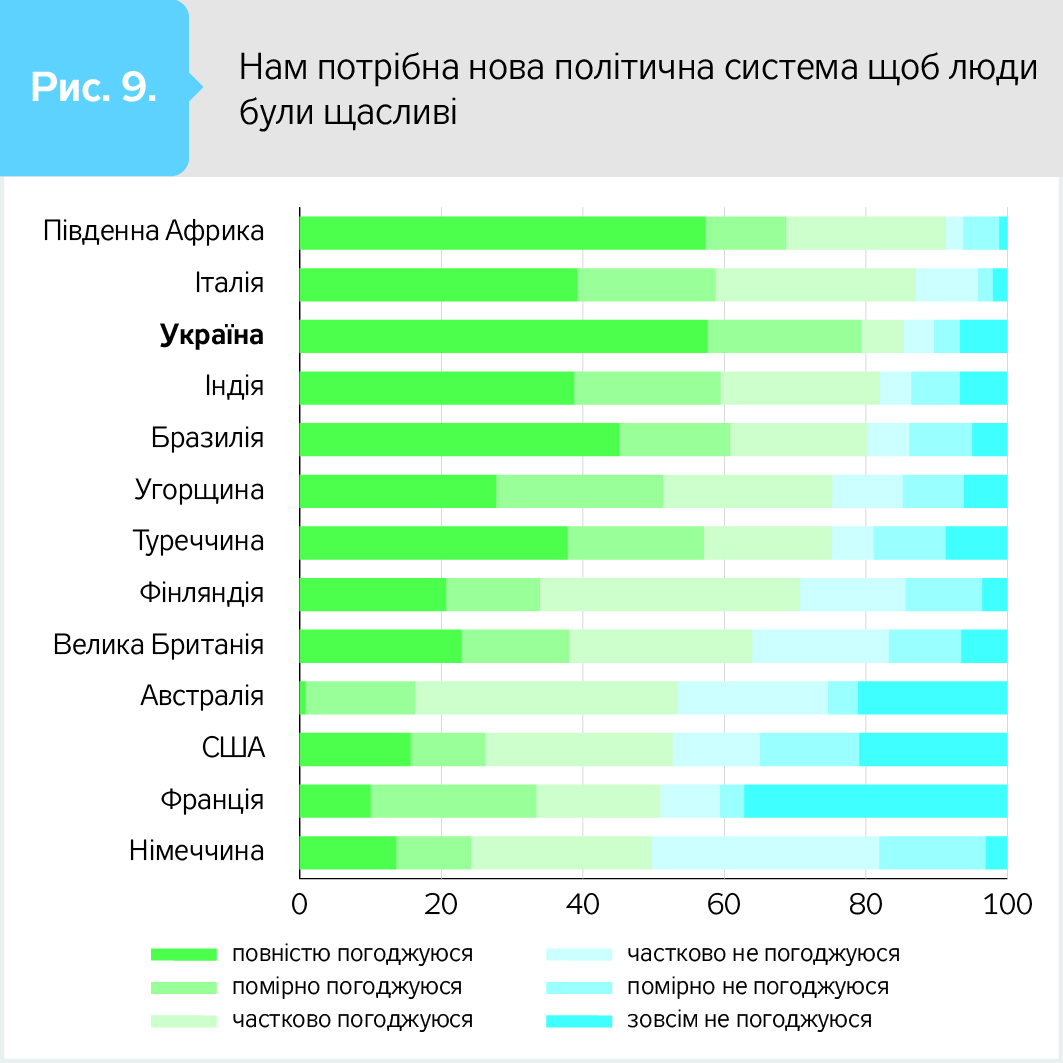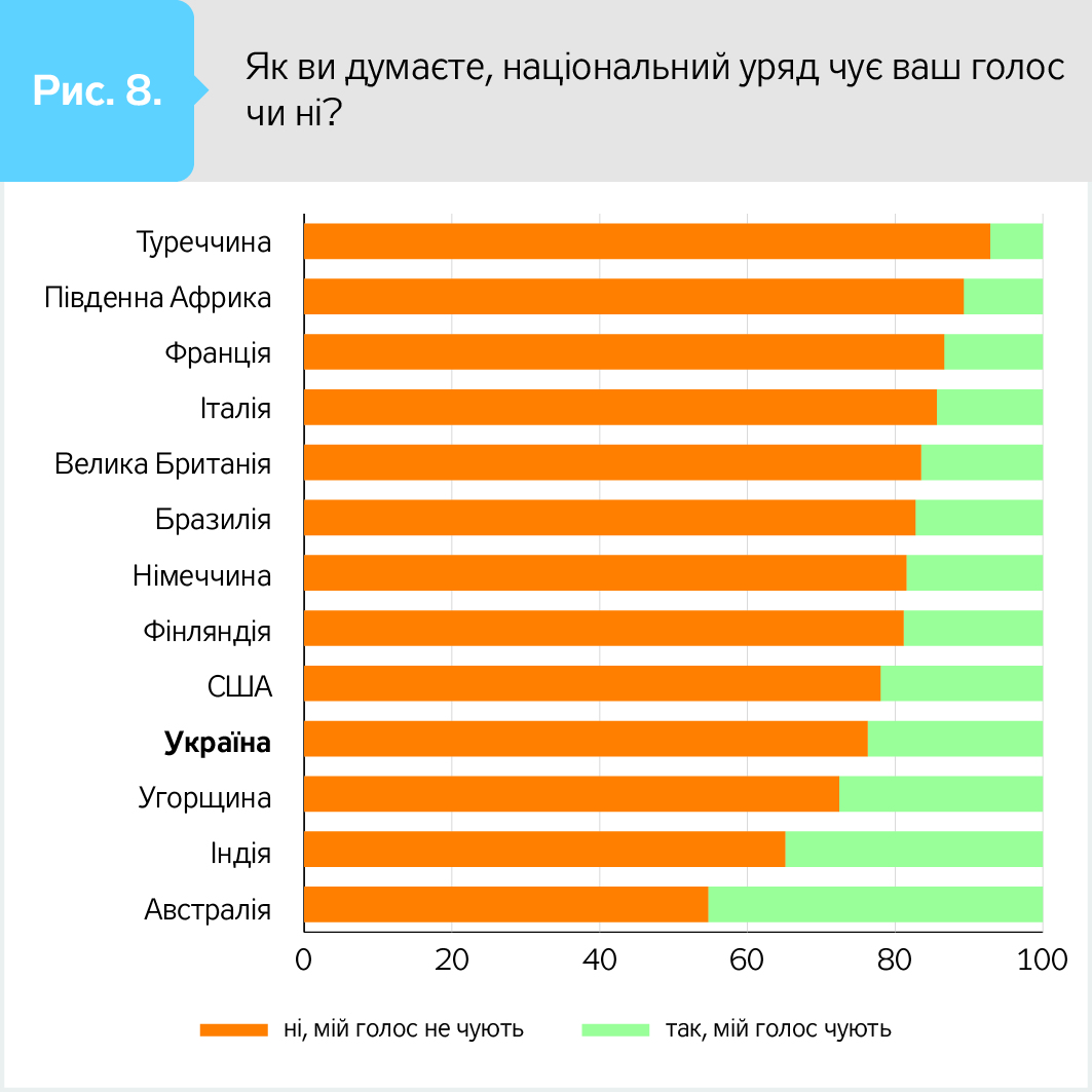 В опитаних країнах більшість громадян вважають, що уряд не чує голосу громадянина (рис. 8). Судячи з даних дослідження, так вважають від 55% громадян Австралії, 65% - Індії, 76% - України до 85% - Італії, 87% - Франції й 93% громадян Туреччини. Наша країна в цьому рейтингу має бадьорий вигляд не тільки тому, що Зеленський читає Фейсбук, а й тому, що регулярно проводить соцдослідження, питально зазираючи в очі народу. Поки що він ведений народом, а не ведучий.