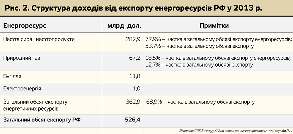 Наведені вище дані свідчать, що для Росії експорт нафти і нафтопродуктів є бюджетоутворюючим фактором, тоді як експорт газу призначений для розширення та зміцнення залежності імпортерів через механізм цінових маніпуляцій.