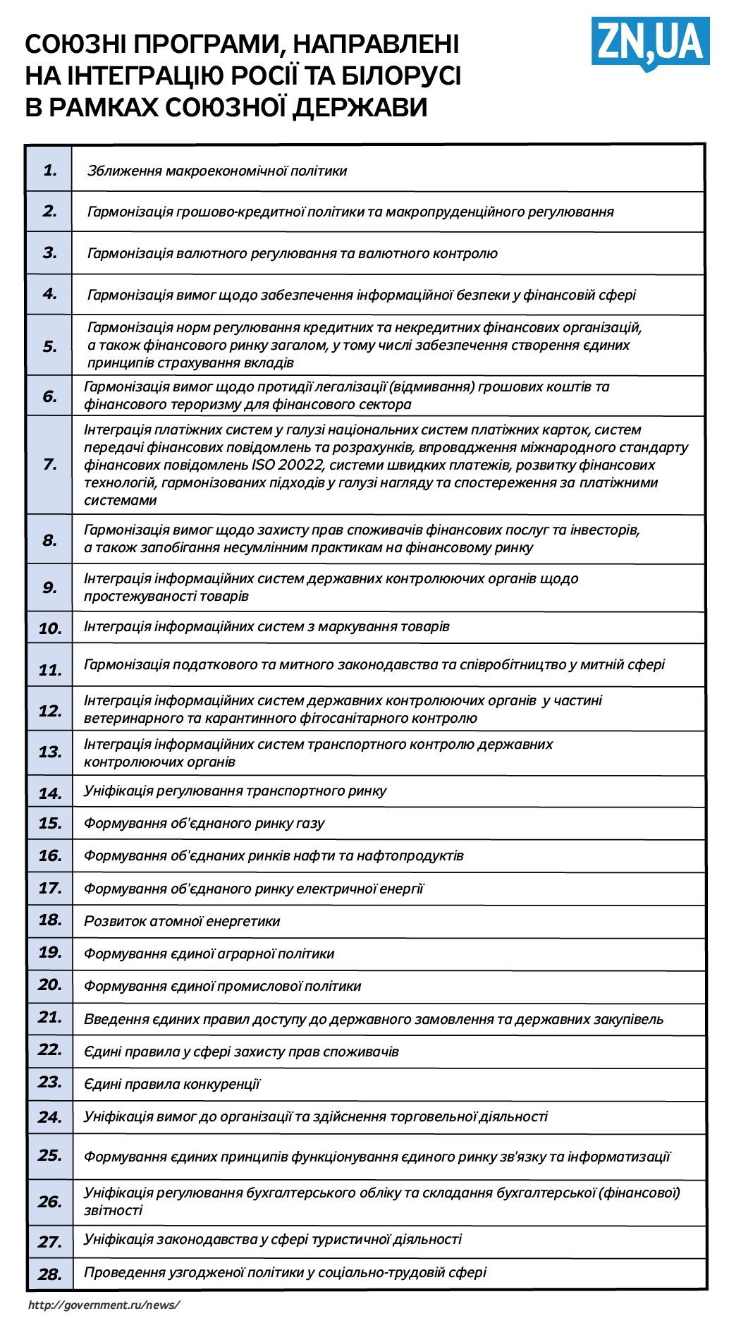 Змісту цього документа Москва і Мінськ не розкривають. Відомо тільки, що напрями охоплюють 28 галузевих програм. Як випливає зі спільної заяви білоруського і російського прем’єрів, оприлюдненої 10 вересня, «дорожні карти» спрямовані на уніфікацію законодавств Білорусі та РФ. Вони передбачають впровадження єдиних принципів оподаткування, спільну політику в кредитно-фінансовій та банківській сферах, промисловості й сільському господарстві, узгоджене регулювання об'єднаних ринків нафти, газу, електроенергії, транспортних послуг тощо.