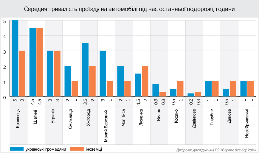 З найбільш тривалим перетином кордону зіштовхнулися українські респонденти, що подорожували автомобілем до Польщі, де середня тривалість в'їзду становила від 4-5 годин на пунктах "Краківець", "Шегині", "Рава-Руська" до 2 годин на пунктах "Смільниця", "Грушів" і "Ягодин". Трохи менше часу витрачали мандрівники на пунктах пропуску зі Словаччиною (3–3,5 години), Угорщиною (1–2 години), Румунією (0,5–1 година), а найдовший названий час очікування становив більше доби.