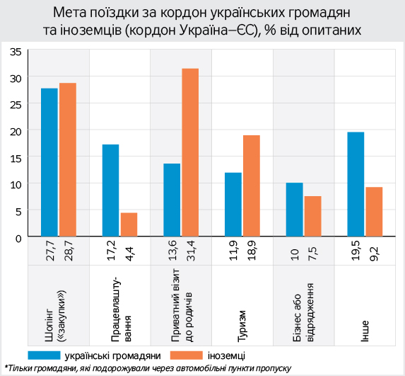 Іноземці, як і українці, найчастіше їздили через кордон для закупівель, але помітно частіше відвідували родичів та подорожували як туристи і рідше їхали з метою працевлаштування.