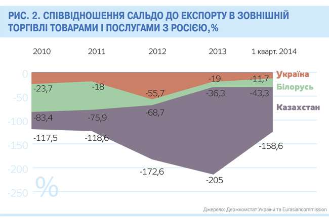 В обох вищезгаданих країнах Митного союзу співвідношення негативного сальдо до їхнього експорту в зовнішній торгівлі з Росією значно більше, ніж в Україні. Отже, ефективність зовнішньої торгівлі України з Росією загалом краща, ніж Казахстану й Білорусі, і особливо суттєво покращилася у 2013–2014 рр. Це очевидний факт.