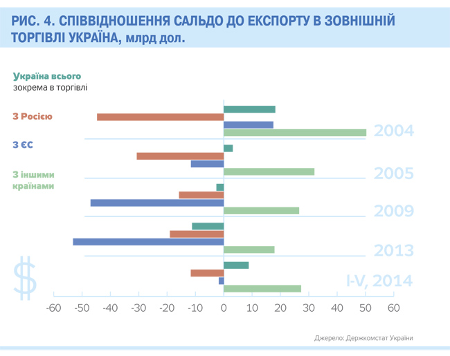 Однак внаслідок необґрунтованої лібералізації імпорту в 2005 р. ситуація в торгівлі України з ЄС різко погіршилася. Тоді було безпідставно ревальвовано гривню та знижено мита на широкий спектр товарів, що привело до засилля імпорту. Вже у 2005 р. сальдо зовнішньої торгівлі України з ЄС з позитивного стало негативним. А в 2009 р. у торгівлі з ЄС внаслідок зростання імпорту (у 1,8 разу) і незростання експорту негативне сальдо сягнуло 5,9 млрд дол., що у співвідношенні до експорту становило 47,2%. У подальші роки ситуація в цьому напрямі ще більше погіршилася. У 2013 р. негативне сальдо зовнішньої торгівлі України з ЄС сягнуло 10,8 млрд, або 53,2% до українського експорту. Ці показники стали значно гіршими, ніж у торгівлі з Росією (див. рис. 3 і рис. 4). По суті, у 2013 р. загальне негативне сальдо зовнішньої торгівлі України (-8,5 млрд дол.) головним чином визначалося за рахунок незбалансованої торгівлі з ЄС.