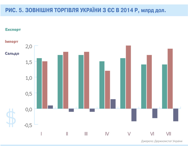 Не знаходять свого статистичного підтвердження сподівання на результати від скасування ЄС в односторонньому порядку ввізних мит для України. Поки що цей жест доброї волі не дає відчутного результату. І не варто думати, що в ЄС про це не здогадувалися раніше чи не знають зараз. Скасування ЄС з травня 2014 р. великої кількості імпортних мит на українські товари не привело до буму їх продажу. Понад те, з травня у торгівлі України з ЄС товарами саме з'явилося негативне сальдо, яке було всі три наступні місяці (див. рис. 5).