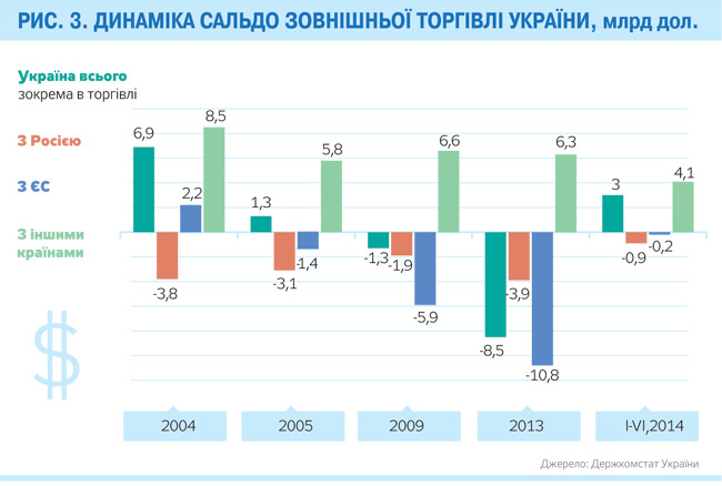 У першому півріччі 2014 р. відбулося загальне збалансування зовнішньої торгівлі України. Вперше після 2004 р. сальдо зовнішньої торгівлі стало знову позитивним (3 млрд дол.). Позитивна динаміка окреслился практично з усіма основними країнами - торговими партнерами України, у тому числі з Росією та ЄС, щоправда, з ЄС - істотніше. Співвідношення негативного сальдо зовнішньої торгівлі України з Росією до експорту становить 11,7%, а з ЄС - лише 1,8%. Отже, як у відносинах з Росією, так і з ЄС, Україна відвойовує позиції збалансованої для себе торгівлі.