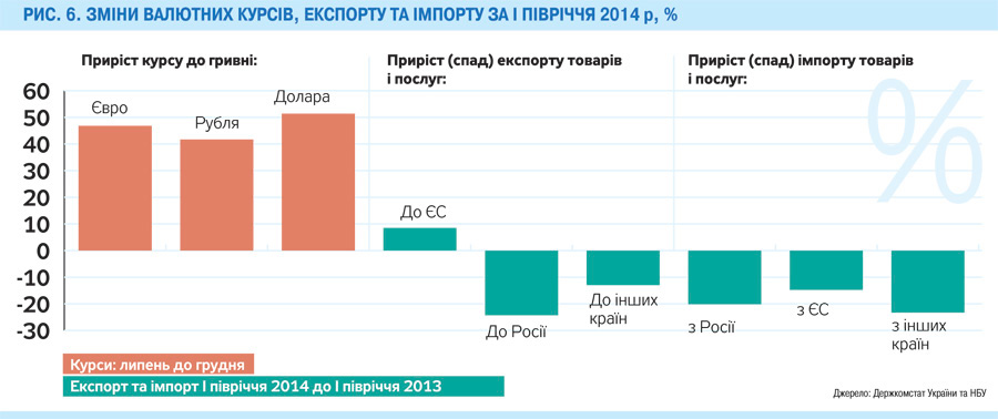 Вплив девальвації гривні на зовнішню торгівлю. З теорії та практики відомо, що девальвація національної валюти стимулює експорт і стримує імпорт. І навпаки - ревальвація стримує експорт і стимулює імпорт. Це Україна відчула і на своєму ринку: щоправда, частіше це було з девальвацією гривні, коли зростав експорт. і рідше (у 2005 р.), коли була ревальвація гривні і зростав імпорт та негативне сальдо зовнішньої торгівлі. Аналогічний вплив девальвації гривні на зовнішню торгівлю проявився і в першому півріччі 2014 р. Однак тут втрутилася економічна та воєнно-політична криза, яка великою мірою скорегувала цю залежність. Тим не менше, зміни в експорті та імпорті адекватні змінам валютних курсів. Лише скорочення експорту до Росії найбільшою мірою сталося через економічну та воєнно-політичну кризу і торгівельну війну. Певним чином це стосується й окремих інших країн, зокрема Казахстану (див. рис. 6).