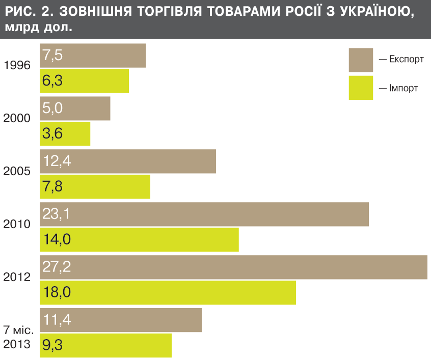 Зовсім інша ситуація між Росією та Україною. Якщо в 1996 р. торгівля між ними була близькою до паритетної, то в 2010–2012 рр. експорт з Росії в Україну вже в 1,5 разу перевищував імпорт з України. Тобто Росія вже давно згортає імпорт з України. Це одна з причин того, що в нашої країни значне від'ємне сальдо торговельного балансу - майже 10 млрд дол. (рис. 2).