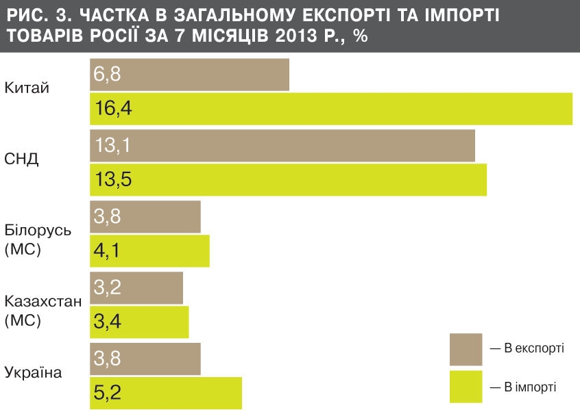 Більш того, якщо до 2005 р. у зовнішній торгівлі товарообіг Росії з Україною перевищував товарообіг Росії з Китаєм, то вже 2012-го товарообіг Росії з Китаєм вдвічі перевищував її товарообіг з Україною. Таке випередження було досягнуте за рахунок тотального проникнення китайського імпорту на російський ринок. І це при тому, що Україна не перший рік має з Росією зону вільної торгівлі (правда, з численними вилученнями). Виходить, юридично Росія не має угоди про ЗВТ з Китаєм, а з Україною має, однак фактично всі преференції надає Китаю. До речі, такого зростання обороту зовнішньої торгівлі, особливо імпорту, як у Китаю з Росією, не демонструють нинішні члени Митного союзу - Казахстан і Білорусь.