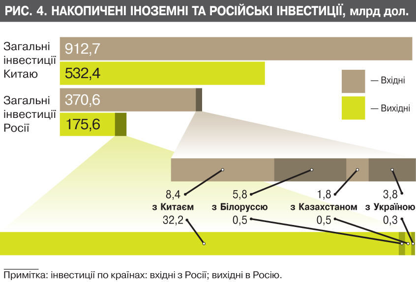 Як видно з наведених даних, інвестиційний потенціал Китаю набагато потужніший, ніж Росії, і тим більше України чи країн Митного союзу. Та й російські інвестиції тягнуться більше в Китай, а не в Білорусь, Україну чи Казахстан. До речі, з Китаю Росія отримує інвестицій у чотири рази більше, ніж дає йому. Стосовно інших згаданих країн відбувається навпаки: Росія віддає інвестицій удесятеро більше, ніж отримує. А Китай нині здійснює активну і досить ліберальну інвестиційну політику: багато вкладає у країни Африки, Латинської Америки, Південно-Східної Азії.