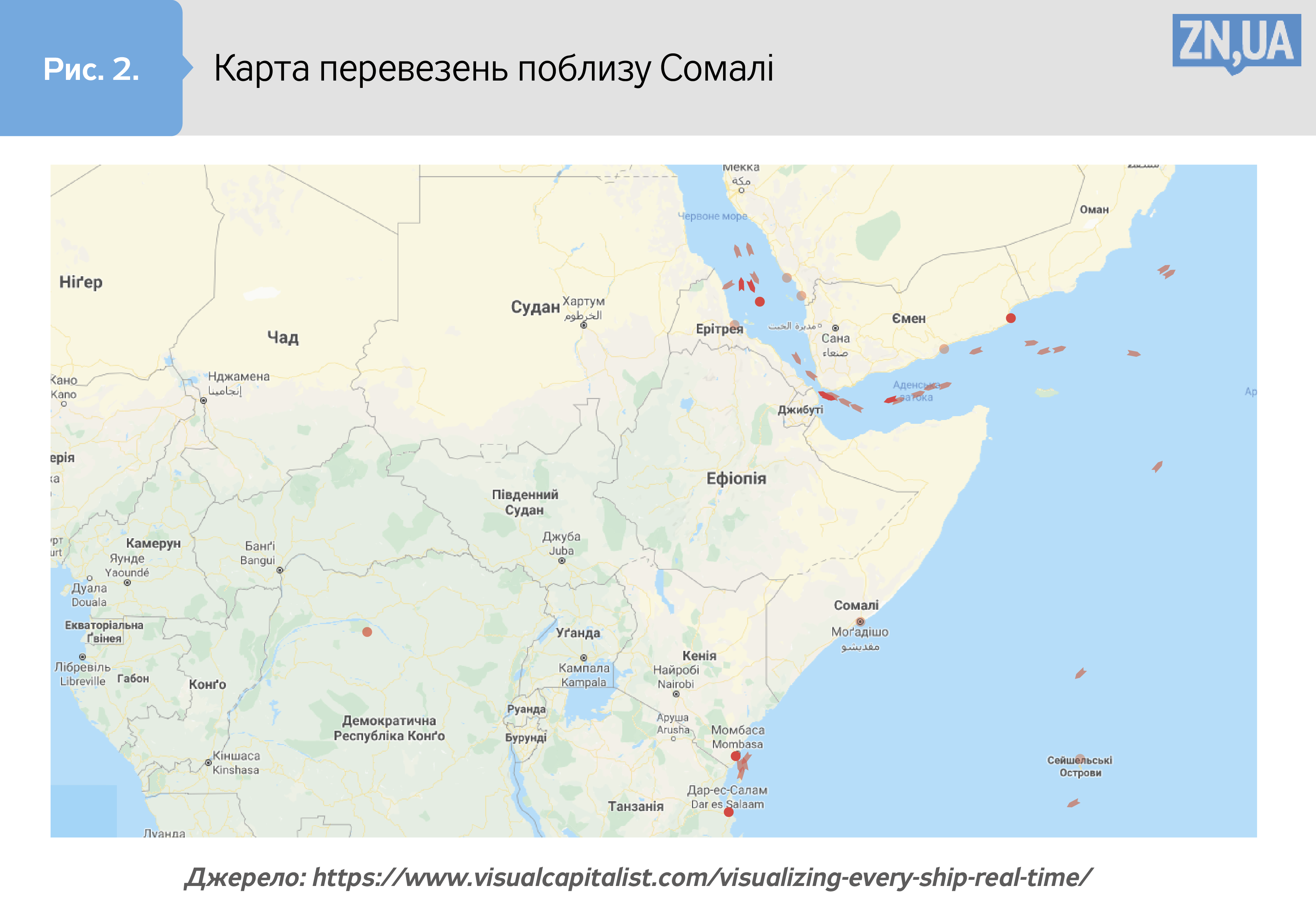 По-третє, Сомалі наближена до одного з центральних морських транспортних маршрутів. Неподалік сомалійського узбережжя розміщені так звані «ворота сліз», або протока Баб-ель-Мандеб, яка відділяє Червоне море від Індійського океану. Ще у 2016 році пораховано, що через ці ворота щодня пропливають 4,8 млн барелів нафти і нафтопродуктів, із яких 2,8 млн прямують на північ, до Суецького каналу і далі до Європи, а інші 2 млн барелів — на південь, через Аденську затоку до Азії. Навіть із нинішніми низькими цінами на нафту, це понад 190 млн доларів на день, величезні гроші для тих, для кого й 100 доларів — справжній статок.