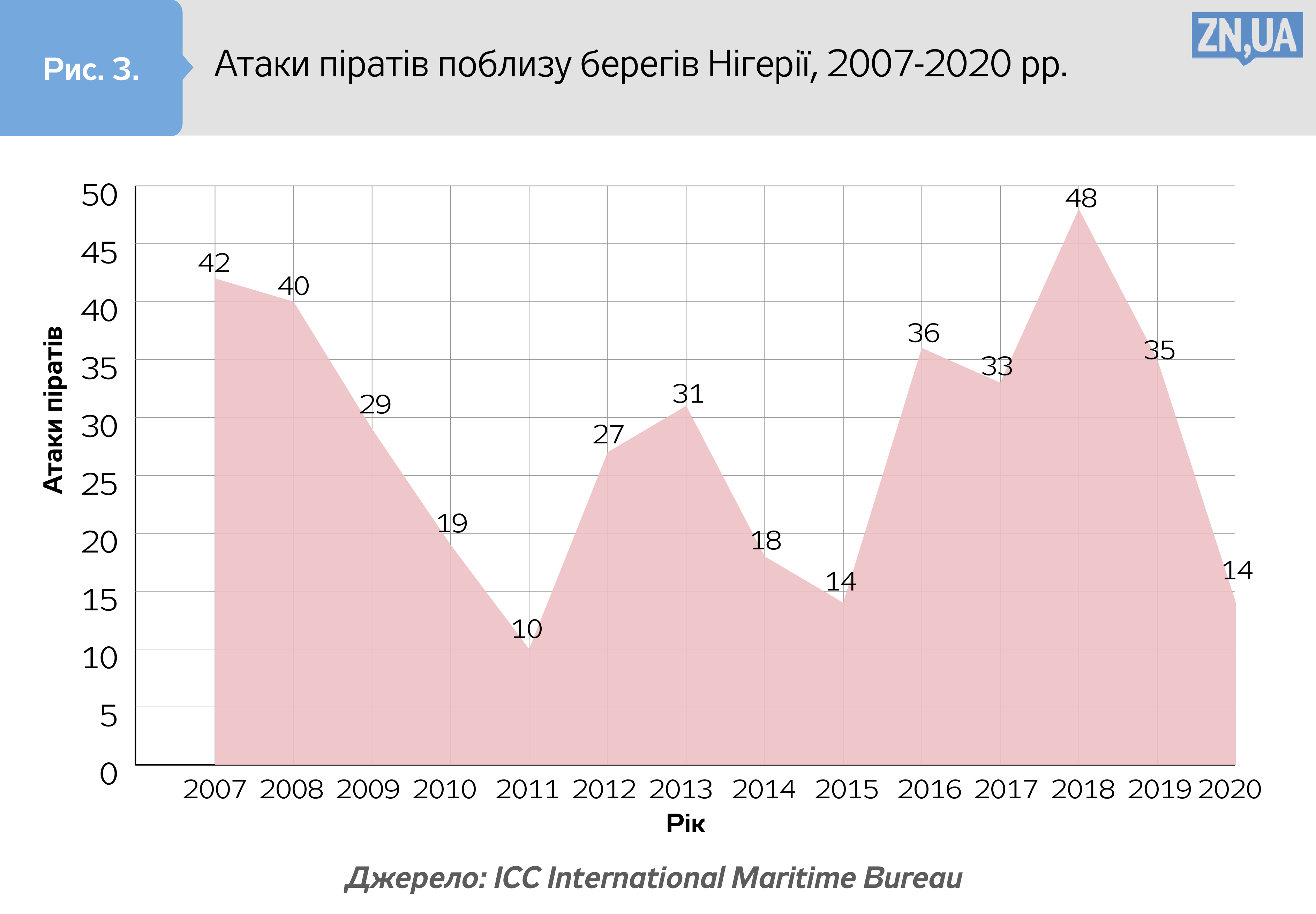 Мета терористів у дельті Нігеру — блокування видобутку нафти в регіоні. Терористи атакують нафтовидобувні платформи, трубопроводи, викрадають і вбивають працівників нафтовидобувних компаній, які трудяться в цьому районі, нападають і викрадають танкери з нафтою поблизу узбережжя. Крім терористів, піратство як джерело доходу використовують місцеві кримінальні угруповання, безробітна молодь та корумповані чиновники. У 2018 р. було зафіксовано найбільшу за 10 років кількість нападів піратів поблизу берегів Нігерії. Судячи з динаміки, тенденція до зростання активності піратів у цьому районі лише посилюватиметься, особливо з огляду на тяжкі економічні наслідки падіння цін на нафту і пандемії коронавірусу.