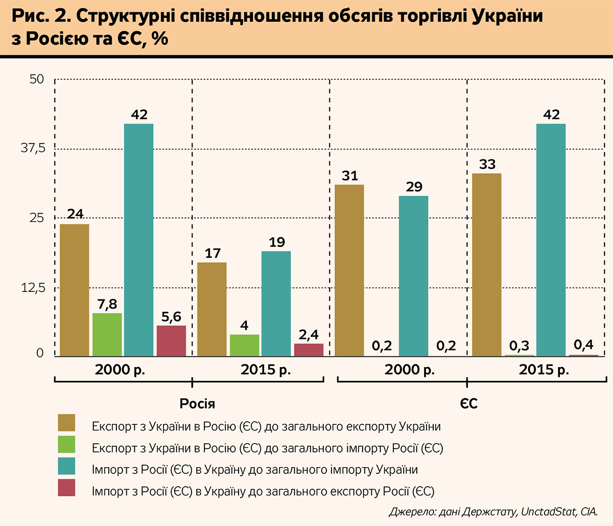 Поэтому уместно остановиться на причинах и следствиях потерь торговли Украины с Россией в контексте последних политических, экономических и других обстоятельств. По приведенным данным видно, что Таможенный союз не дал его партнерам ожидаемых темпов роста объемов торговли. Это еще раз подтверждает, что Таможенный союз - это политический проект России, а не экономически взаимовыгодное интеграционное формирование. Именно это и ожидало Украину в случае ее вступления в ТС. Более того, ухудшение торговли уже произошло, причем задолго до российско-украинского конфликта. Еще в 2013 г. в публикации "Украина и Таможенный союз: проблемы интеграции" (ZN.UA №11 от 22 марта 2013 г.) автор убедительно показал динамику ухудшения показателей торговли Украины с Россией именно из-за того, что Россия отдалилась от Украины в сфере реальной экономической интеграции по всем направлениям (торговле, производственной кооперации, инвестиционным проектам и т.п.). Именно из-за этого доля экспорта из Украины в Россию в украинском экспорте с 2000-го по 2015-й снизилась с 24 до 17%, а в российском импорте - с 7,8 до 4%. Аналогичная ситуация и по импорту из России в Украину, структурные соотношения которого также сократились в два–три раза. В то же время противоположная ситуация в торговле Украины с ЕС. Доля экспорта из Украины в ЕС в общем украинском экспорте возросла за этот период с 31 до 33%, а доля экспорта из Украины в ЕС в общем импорте ЕС - с 0,2 до 0,3%. Еще более впечатляющая картина относительно импорта из ЕС в Украину, в частности, доля импорта из ЕС в Украину в общем украинском импорте увеличилась с 29 до 42% (рис. 2).