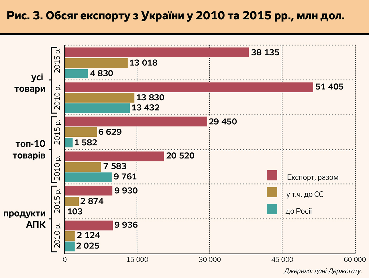 Ще більш вражаюча ситуація з продукцією АПК. Обсяги її експорту з України до ЄС у 28 разів більші, ніж до Росії. І проблема зовсім не у війні з Росією, а в природно зумовленій конкуренції українського і російського продовольчих ринків: за обсягами, номенклатурою, асортиментом, якістю продукції. Торгово-продовольчі війни, які, до речі, розпочалися ще у 2006 р., були лише наслідком давно відомої конкуренції ринків.