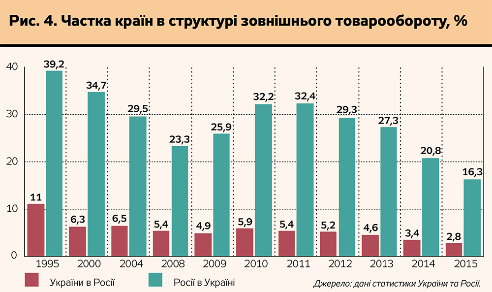 Наконец еще один аспект. Многие из экспертов связывают проблемы торговли Украины с Россией с Евромайданом, сменой власти в Украине, оккупацией Крыма и агрессией в Донбассе. Но следует взглянуть на динамику статистики и вспомнить некоторые факты. При президентстве Л.Кучмы, которого нередко называли пророссийским, действительно прилагалось много усилий для расширения разностороннего экономического сотрудничества с Россией. А что Украина получила в ответ со стороны России? Свертывание внешней торговли, производственной кооперации, провал ряда важных и задекларированных на самом высоком уровне (на уровне президентов и правительств) проектов наподобие Ан-70 и др. А в дополнение осенью 2003 г. Украина столкнулась с первой попыткой российского похода на Крым через остров Тузлу. Это же повторилось и при президентстве В.Януковича, в пророссийскости которого никогда и ни у кого не возникало сомнений, но при правлении которого были, как это ни удивительно, те же негативные следствия - свертывание экономического сотрудничества во внешней торговле и еще в большей мере в реализации обещанных российской стороной совместных проектов (рис. 4).