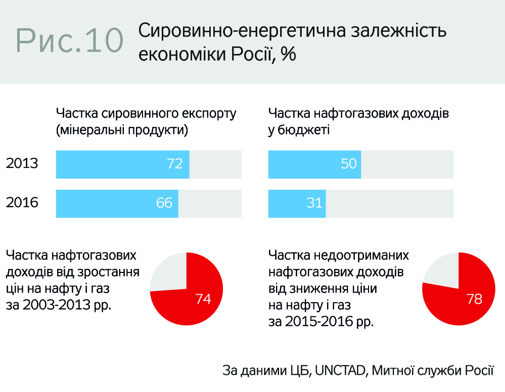 Фактів, що російська економіка є структурно деформованою, сировинно-енергетичною, теж більш ніж достатньо. Половина бюджету Росії формувалася за рахунок нафтогазових доходів, у т.ч. 74% - за рахунок зростання цін.