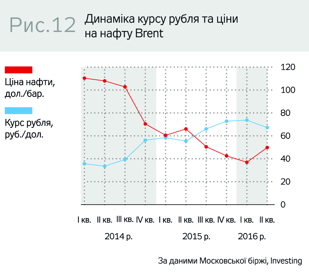 Нарешті, про міф впливу санкцій на девальвацію рубля. Російськими вченими-економістами давно доведено тісну кореляційну залежність між курсом цін на нафту і курсом рубля. Не треба бути великим економістом, щоб зрозуміти це хоча б з простого графіка. Навіть домогосподарки могли 2015 року відслідковувати, як у парі падали ціна на нафту і курс рубля. Тому Світовий банк стверджує, що "було б невірно зараховувати девальвацію рубля до наслідків санкцій, тому що зниження цін на нафту, в будь-якому випадку, мало значно сильніший вплив". А оскільки падіння цін на нафту не пов'язане з санкціями, то й обвал рубля - не заслуга санкцій. Отже, окрім фактору ціни на нафту великий вплив мають інші негативи економіки Росії: масований відтік капіталу і сировинно-енергетична залежність економіки.