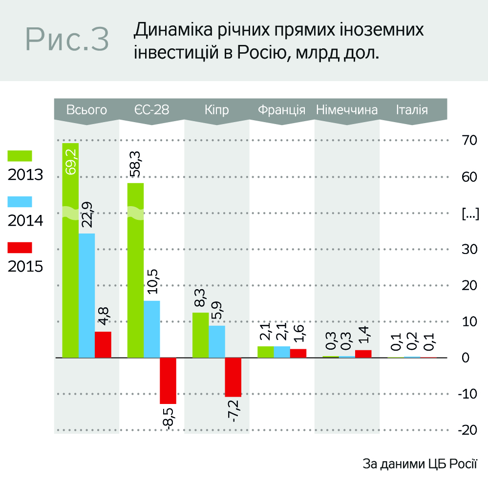 2013-м обсяг прямих іноземних інвестицій скоротився в 14,5 разу. Ситуація з європейськими інвестиціями ще катастрофічніша. Якщо в 2013 р. з ЄС було залучено 58,3 млрд дол., то в 2015 р. - вилучено 8,5 млрд дол. Але якщо вникнути в покраїнову структуру, то відкривається цікава картина. Майже 90% вилучених інвестицій