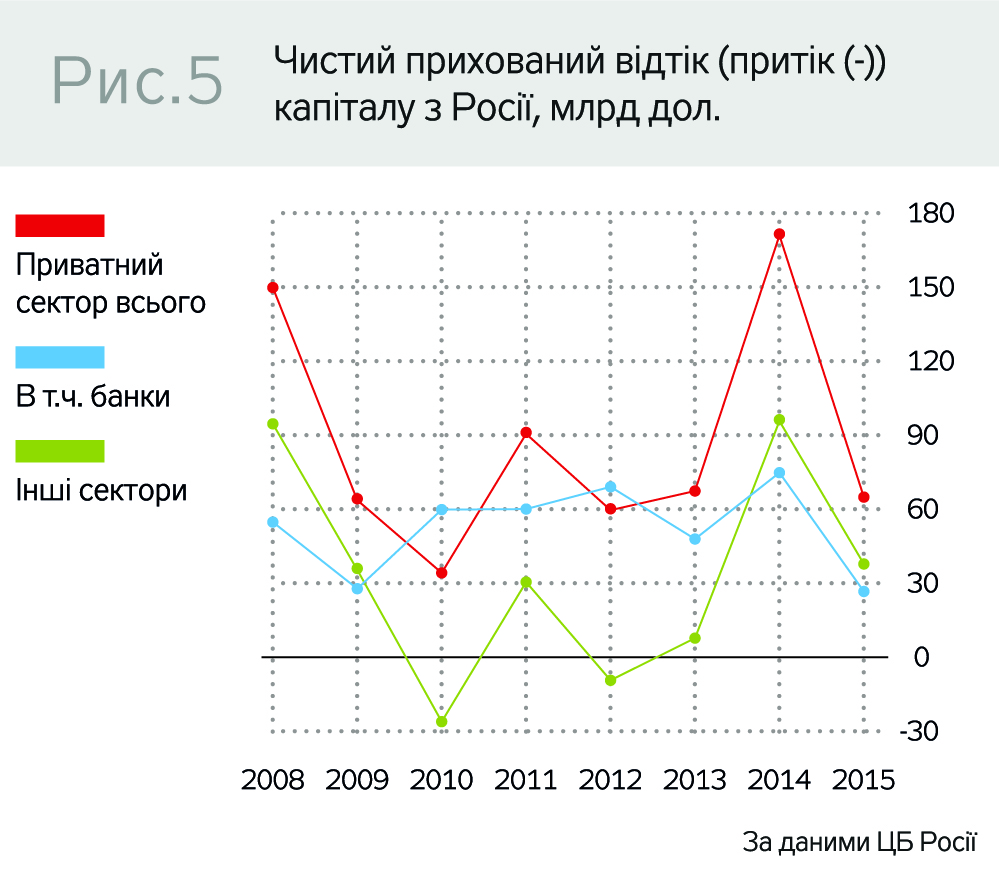 Але найдраматичнішим є те, що різко зріс неофіційний (прихований) відтік (втеча) російського капіталу. 2014 року втекло 153 млрд дол., що на 93 млрд дол. більше, ніж 2013-го.